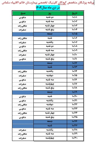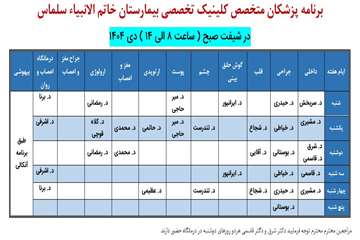 برنامه درمانگاه تخصصی بیمارستان خاتم الانبیاء در دی ماه 1404 1404/10/01 - 12:15 - تعداد بازدید: 41 - تعداد بازدیدکننده: 39 - کد خبر : 23549 - گروه خبری : آخرین اخبار,گالری تصویر - تعداد نظرات : 0